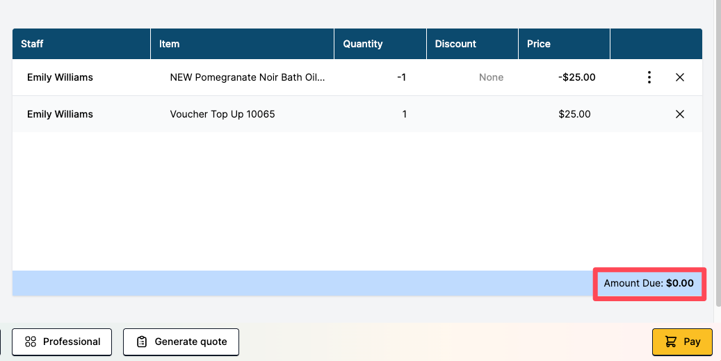 The amount due should total to 0.00, as the refund amount and gift card amount are the same.