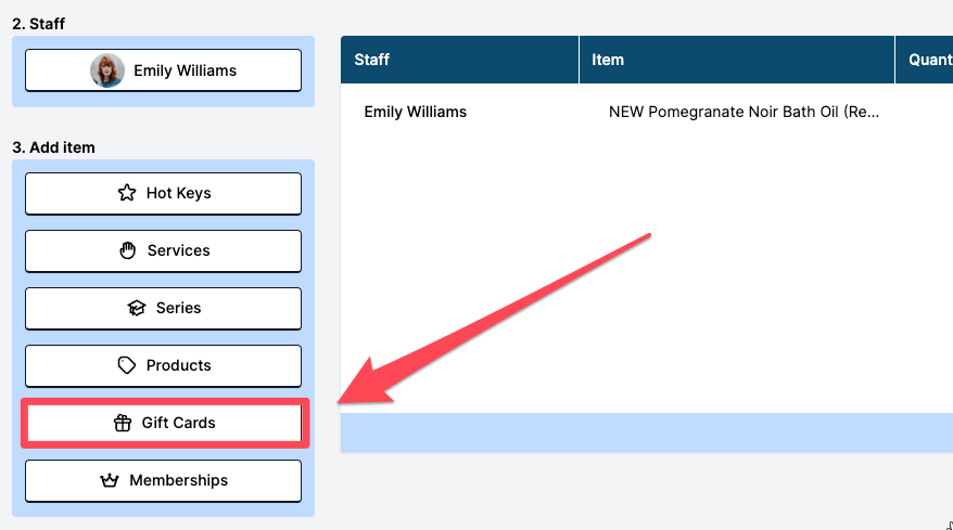 Next, select Gift Cards/Vouchers to add the gift card to the transaction.