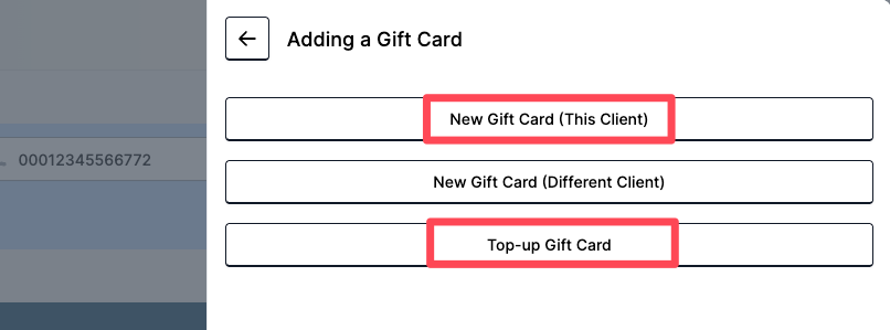 If the client doesn't already have a gift card, select the New Gift Card/Voucher (This Client) option. If they already have a gift card, select the Top-up option, then select their gift card from the list.