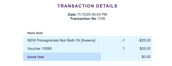 The receipt will show the original item(s) as a negative amount (refund) and the gift card as a positive amount.