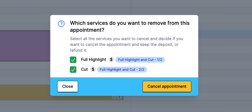Next, if the appointment includes multiple services, select the services you wish to refund the deposit for, then select Cancel appointment.