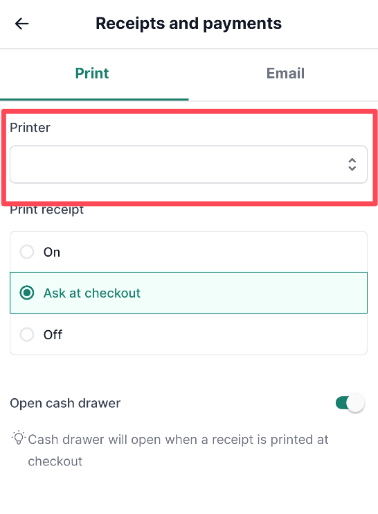 Under Printer, select the name of the installed receipt printer you wish to use.