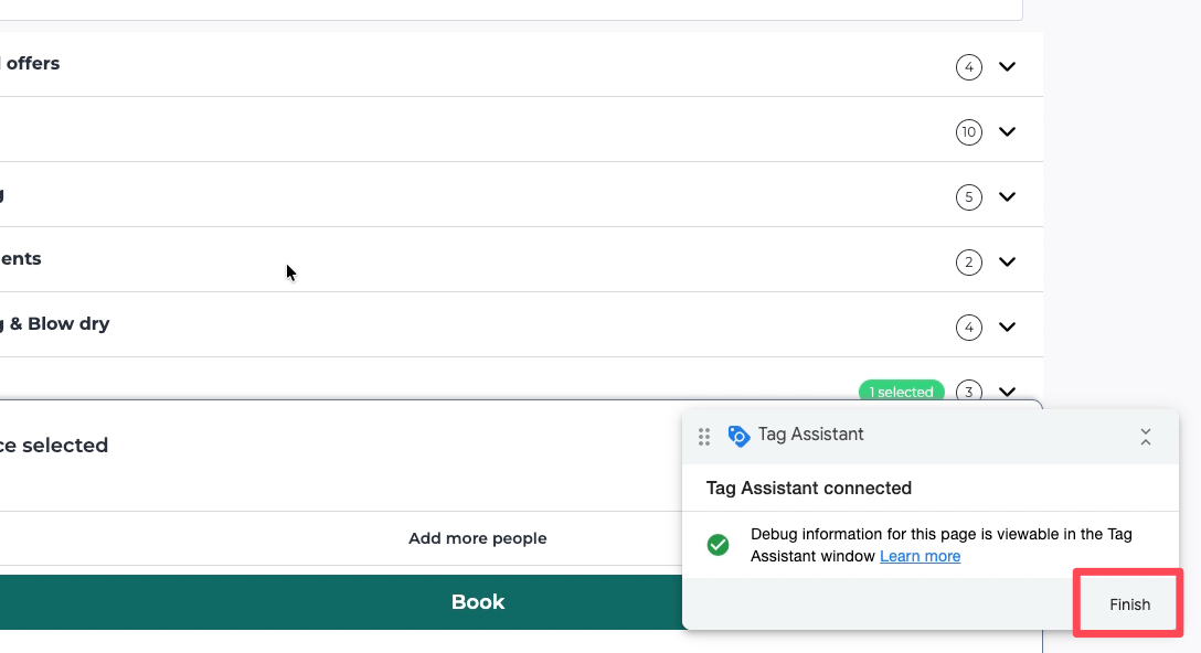 After a few seconds, your Phorest online booking page will appear. Click through a few pages to simulate client booking (e.g., select a service and click Book), then click Finish. A full booking is not required; just browsing a few pages is enough.
