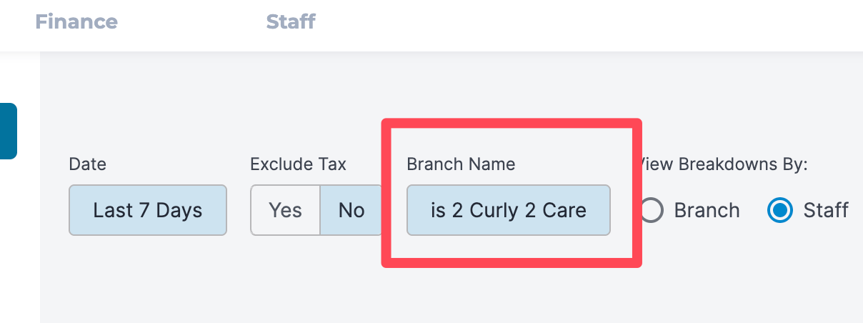 One access is removed, the Branch Name filter on the relevant dashboard will not appear for that staff member, meaning they can only view data for the location they are currently accessing.