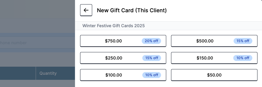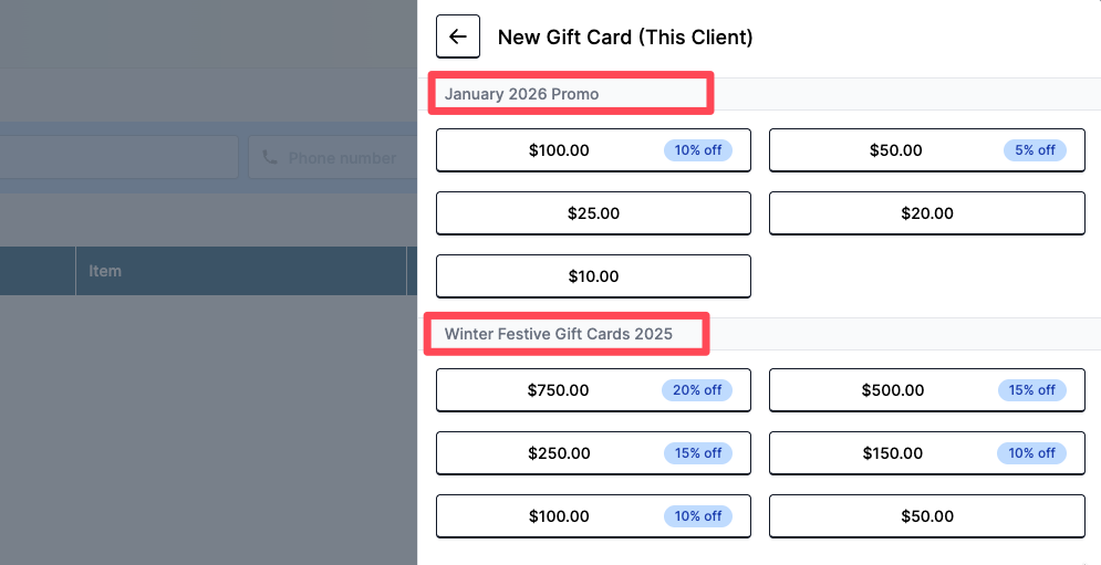 A Gift Card Campaign is a set of ready-made Gift Card options you create in advance, each with a preset value and optional discount, so that staff can sell them in a couple of clicks. You can group the options into categories, set when they’re available, and control when sales should start and stop.