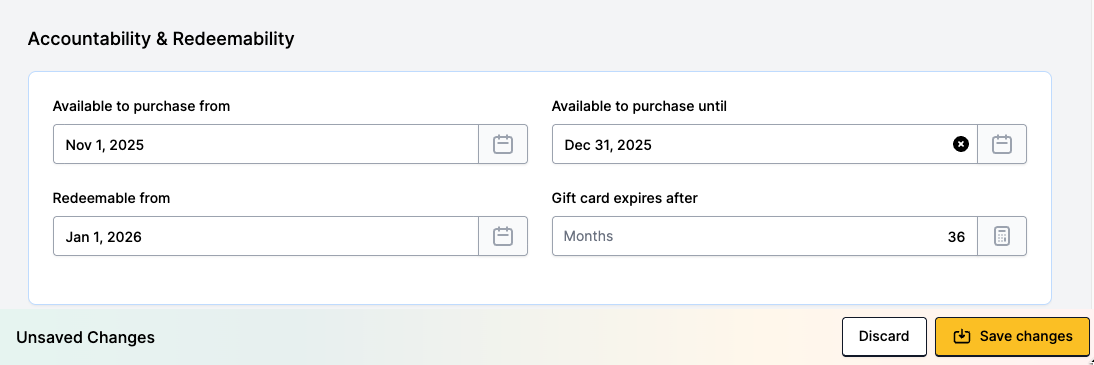 Finally, set the dates when the gift cards will be available for purchase, when clients can start redeeming them, and how many months remain until the gift card expires. Once done, click Save changes to finish.