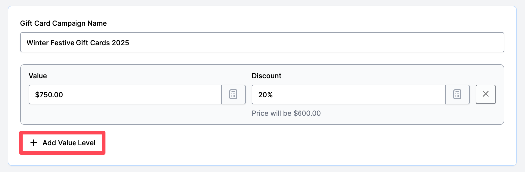 You can add multiple gift card options to the campaign by selecting Add Value Level.
