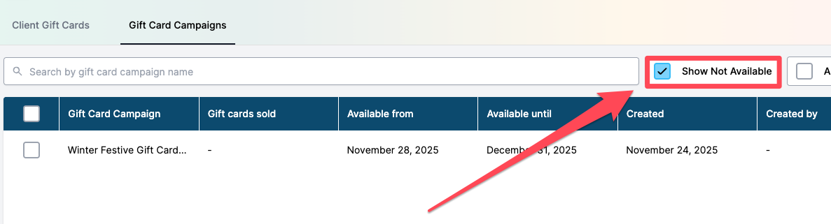 If your campaign doesn't appear after saving, this is because the Available to purchase from and until dates are outside the current date range. This is normal, and your campaign will become visible once it is available for purchase. If you would still like to view it now, click the Show Not Available filter.