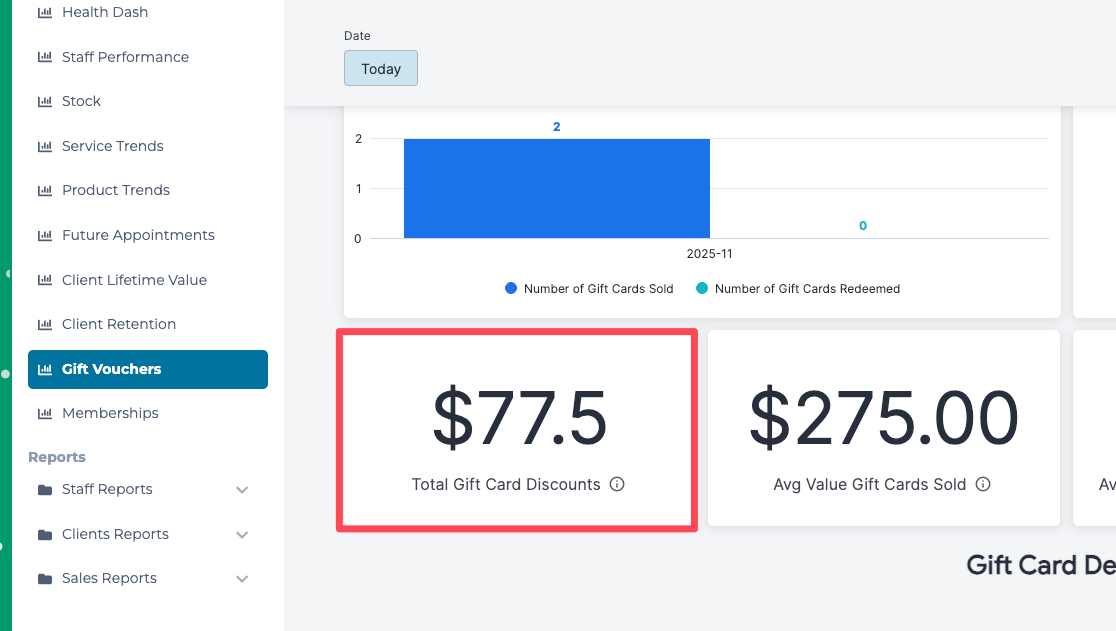 You can click on the Total Gift Card Discounts number to see a detailed breakdown of each sale contributing to that discount total.