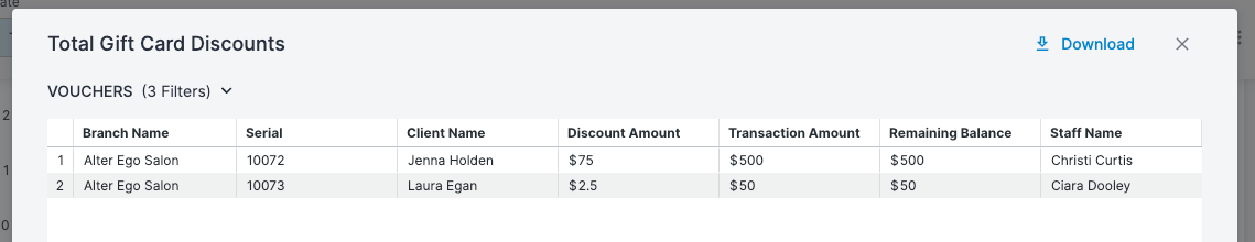 For a detailed report on discounted gift card sales, go to Manager > Reports > Gift Vouchers.