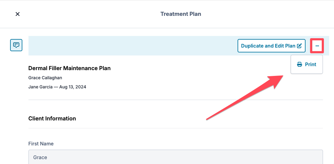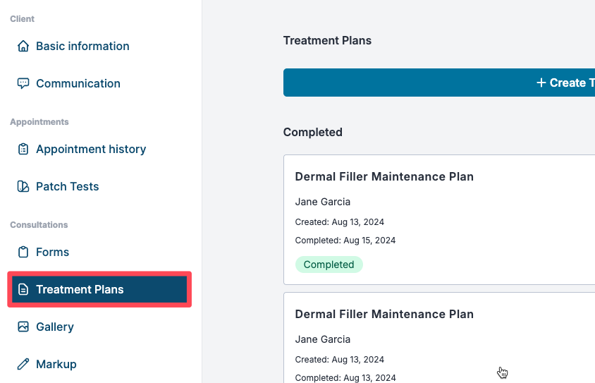 To download or print a patient's Treatment Plan, go to Clients, open their client card, and go to the Treatment Plans section.