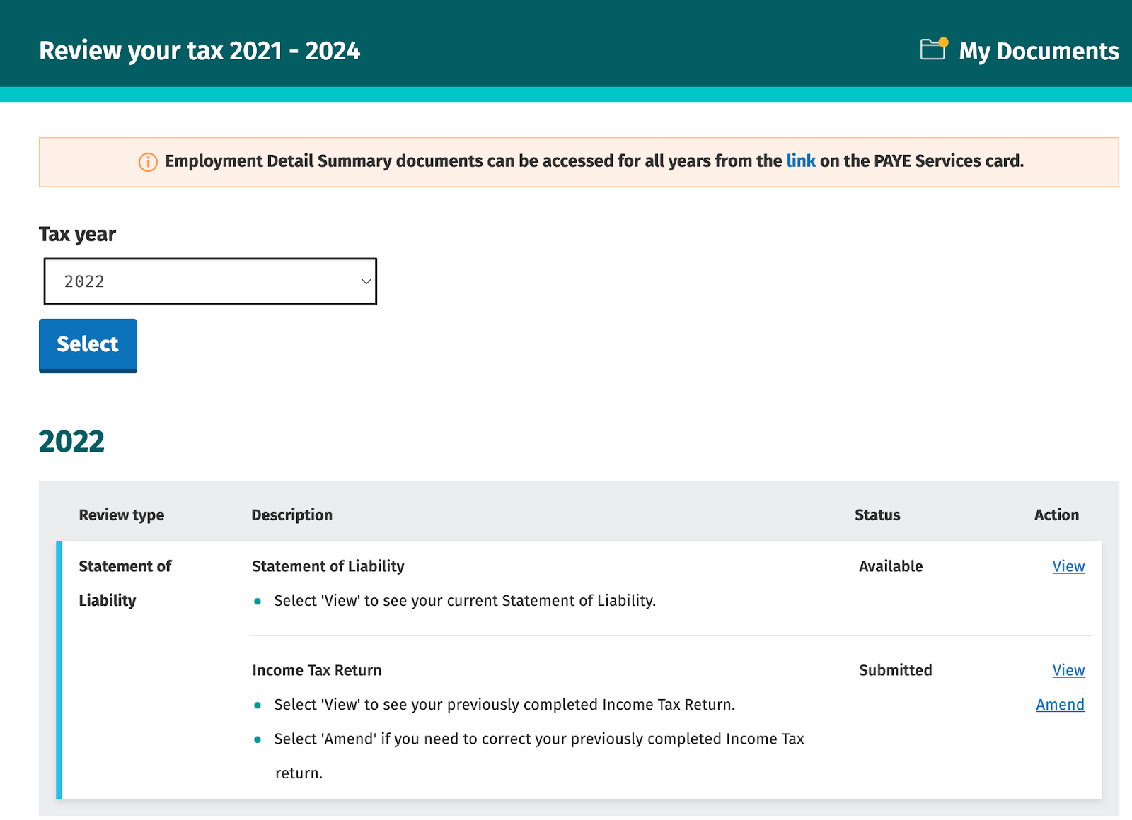 - Choose the relevant tax year and, under the Income Tax Return panel, click âAmend.â