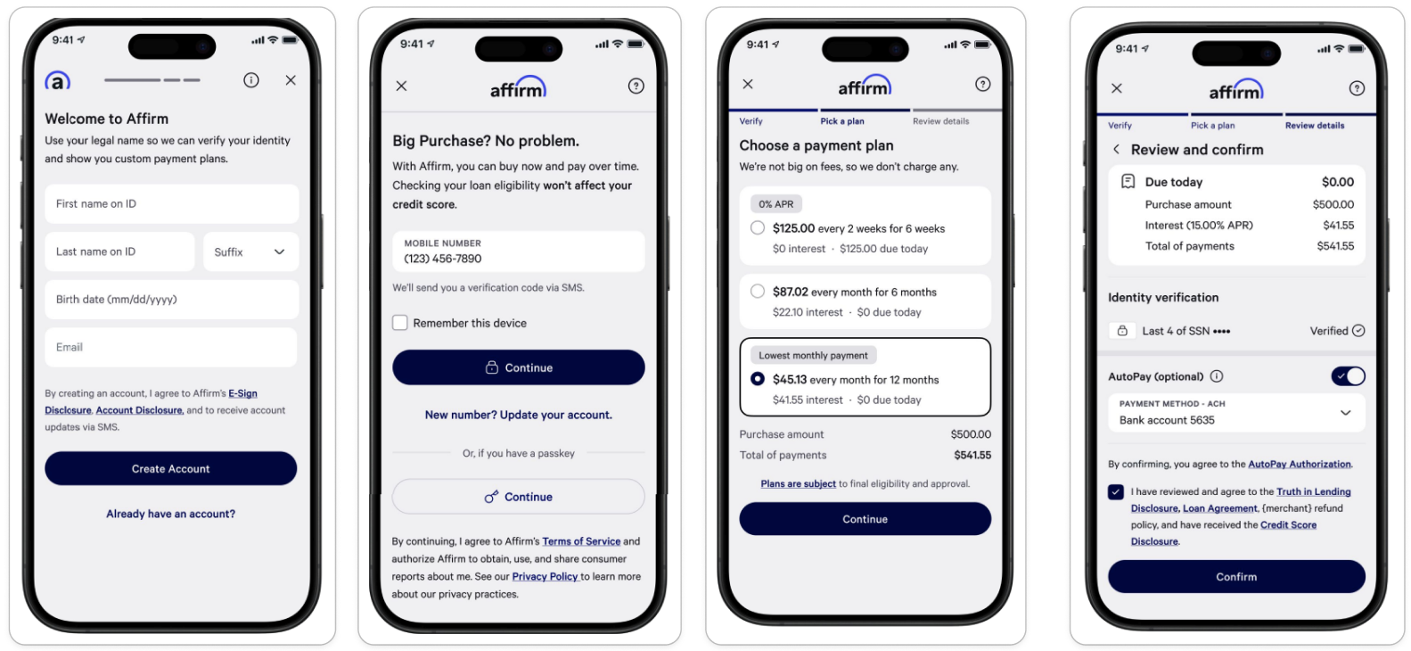 After scanning the QR code, clients are brought to the Affirm site, where they can create an account (or log in to an existing one) and choose their payment plan for this purchase.