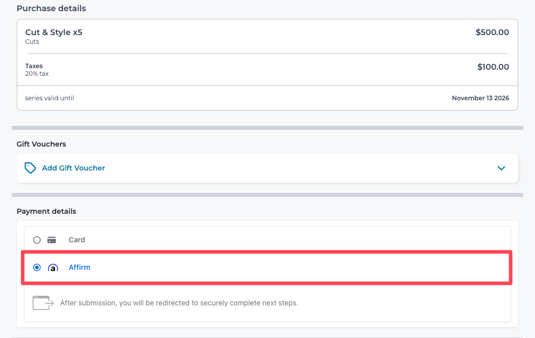 When purchasing a Series/Course online, clients can choose the Affirm payment method.