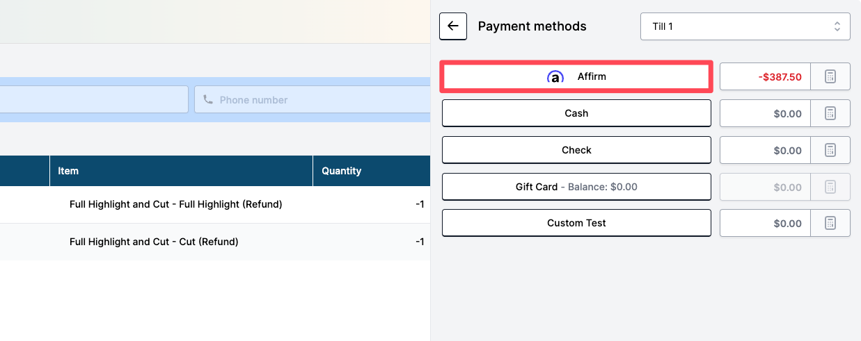 When processing a refund, select the Affirm payment method, then Complete payment.