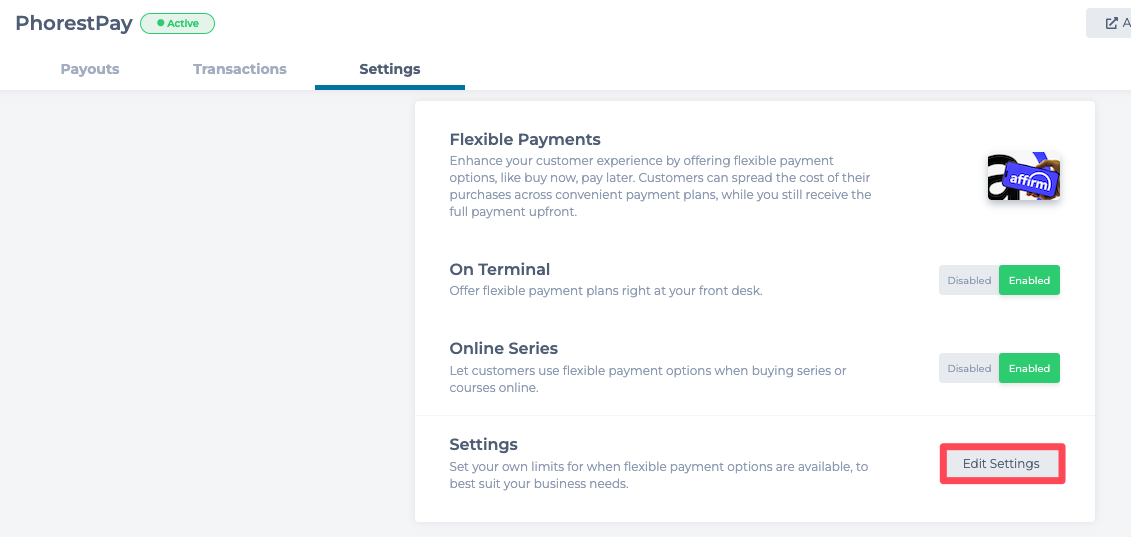 If you'd like to change the minimum spend threshold, go to Edit Settings in the Flexible Payments settings section and update the Minimum Spend for PhorestPay Terminal payments, Online Series/Course purchases, or both.