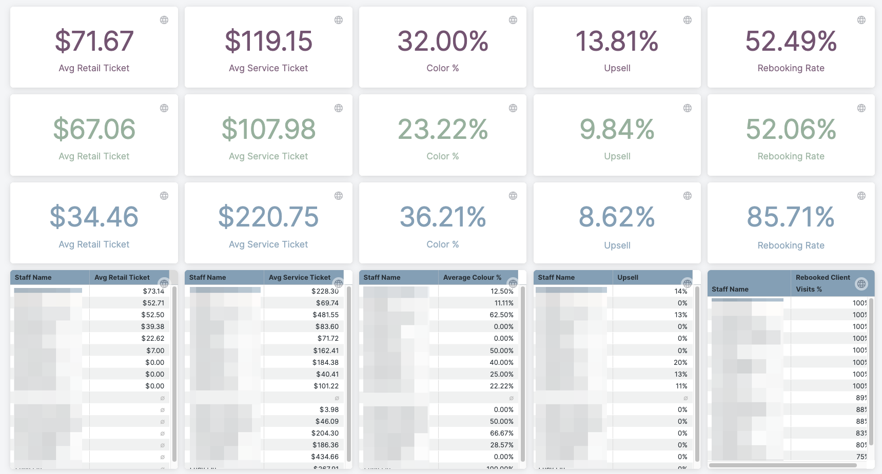 On the dashboard, Purple tiles represent all Phorest x Davines salons, Green tiles represent Phorest salons managed by your Davines representative, and Blue tiles show your salon’s results. Below the tiles, you'll see a staff leaderboard for each metric.