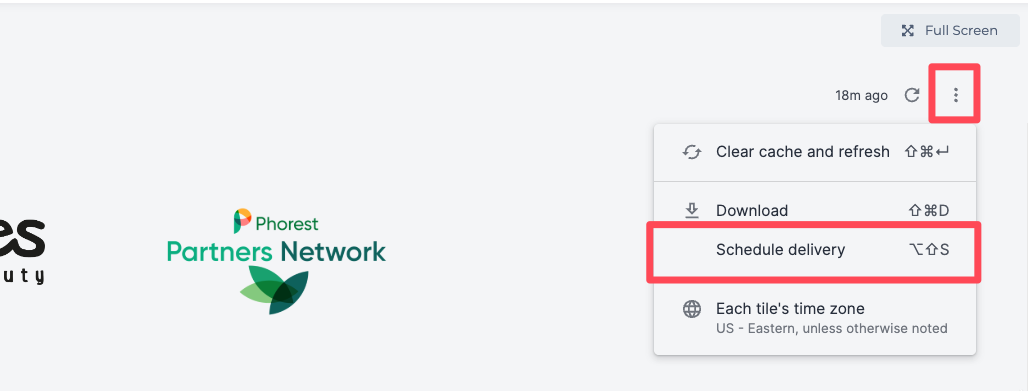 To do this, click the three dots in the top-right corner of the dashboard and select Schedule delivery.