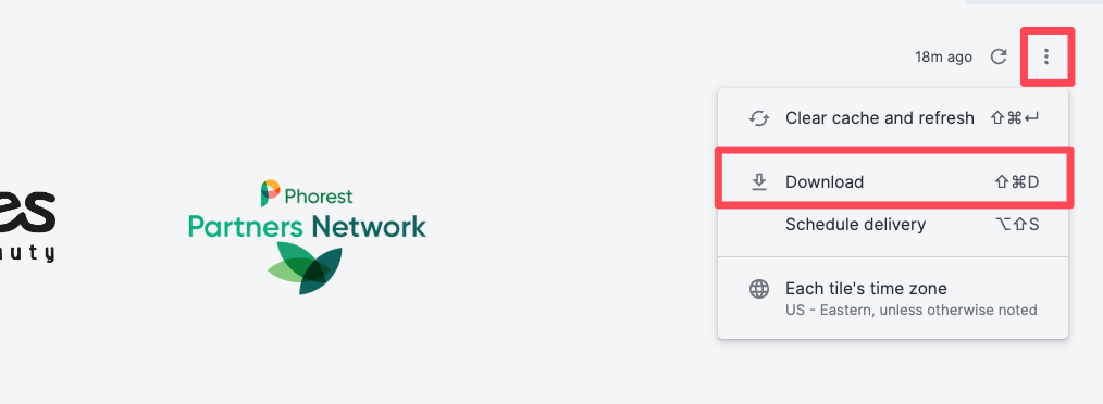 To download the dashboard, click the three dots in the top-right corner of the dashboard and select Download.