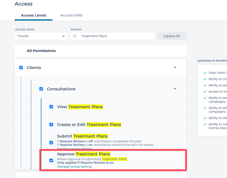 Next, review your access level permissions to decide who should and shouldn't be able to review and approve submitted Treatment Plans.