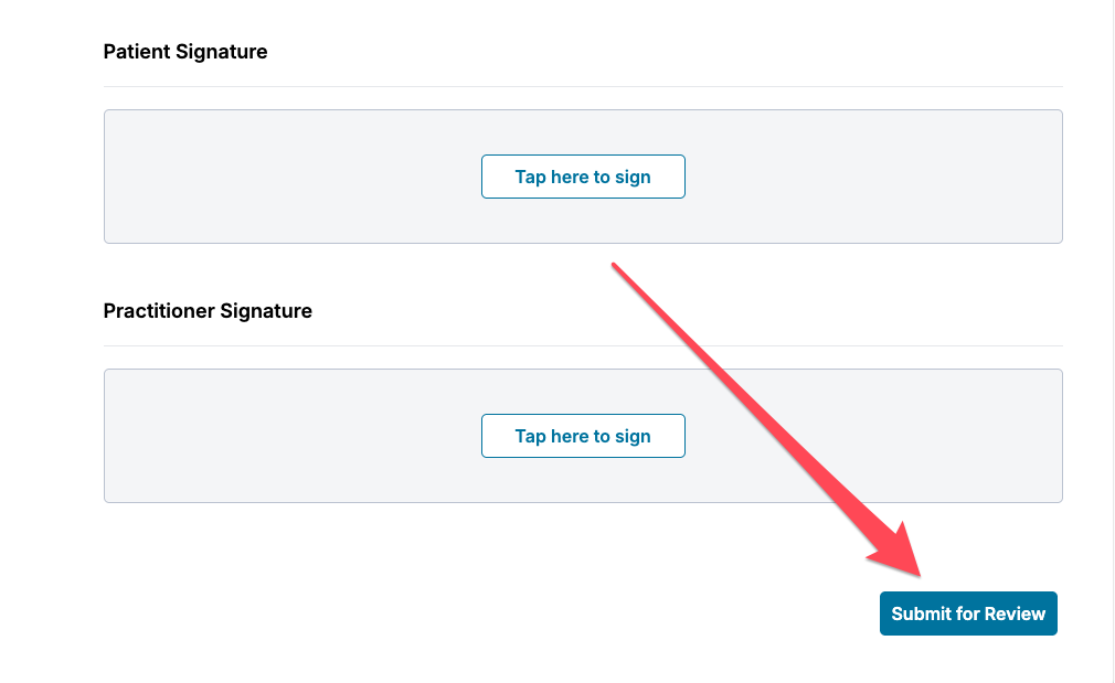 Once the approval setting is enabled, any Treatment Plans that require review before completion will now show a Submit for Review button at the end, whereas plans that don't require review will show a Save and Complete button.