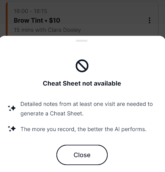 To generate a Cheat Sheet, tap on a client's appointment, then tap Cheat Sheet.