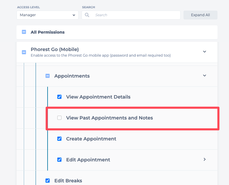 The Cheat Sheet access is associated with the View Past Appointments and Notes access permission under Phorest Go (Mobile).