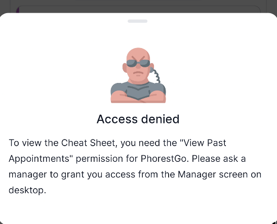 If a staff member does not have this permission and taps the Cheat Sheet button, they will see an Access denied message.