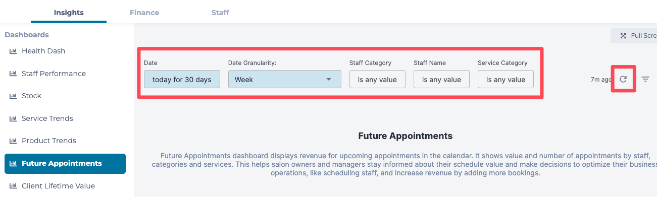 Next, set your filters by selecting a specific date range or choosing a particular Staff Category, Staff Name(s), or Service Category. Then, click Reload to apply your filters.