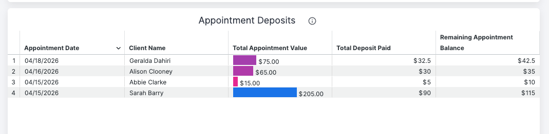 Finally, scroll down to the Appointment Deposits report to see a list of future appointments with deposits that match your filters.
