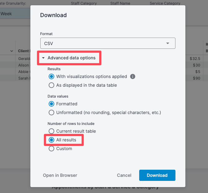 If your report contains more than 500 rows of data, please select Advanced data options and choose All results under 'Number of rows to include' to make sure all data is included in the export.