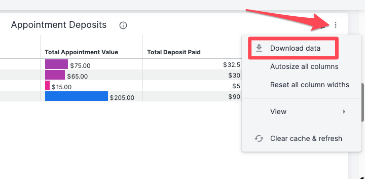 To download the report, click the 3 dots in the top-right corner of the report, and select Download data.