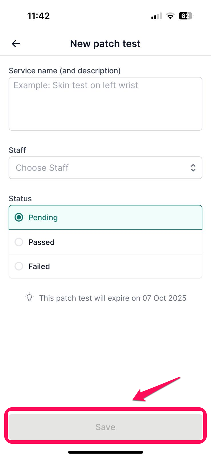 Add the Service name (and description) of the patch test and choose a Staff member. Choose the test Status and Save.