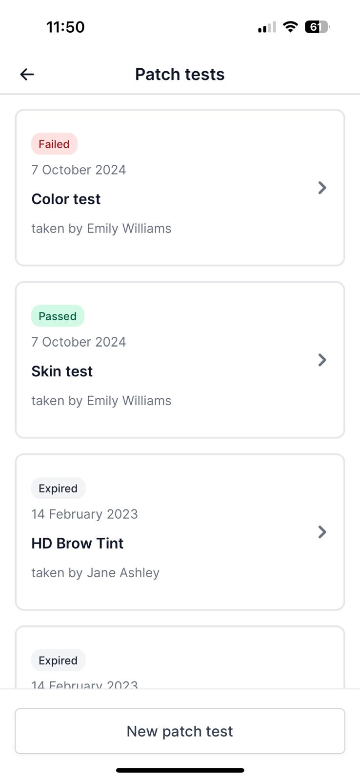 In the PhorestGo app, go to More > Clients. Search for the client > Tap Patch tests.