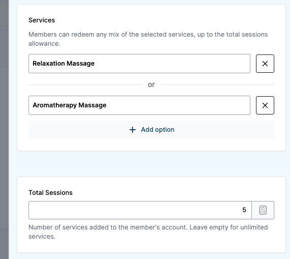 To create an option of services, add one service and then click Add option to add another. When specifying the Total Sessions in a choice, the number of remaining sessions is reduced each time one of the choices is booked.