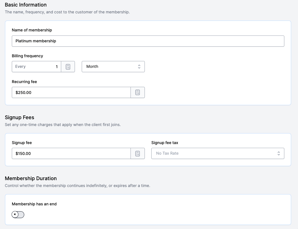 Signup fee: | This is a one-off fee that customers pay when they purchase the membership, in addition to their recurring fee. |