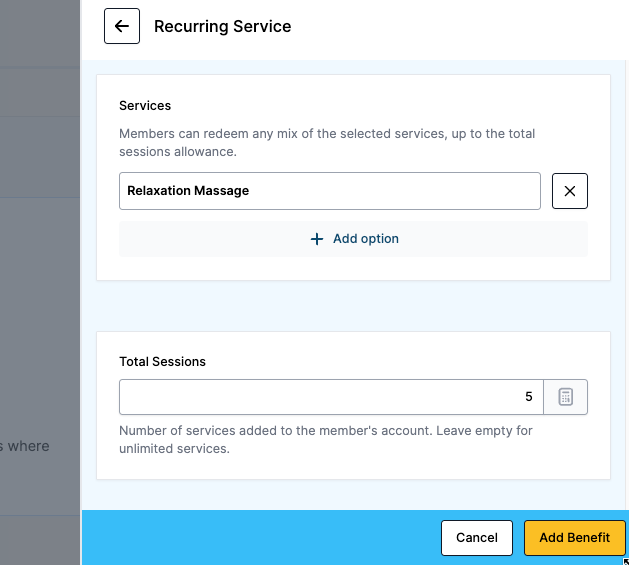 The Recurring Service option allows you to offer a set number of selected services that clients can redeem each billing cycle.