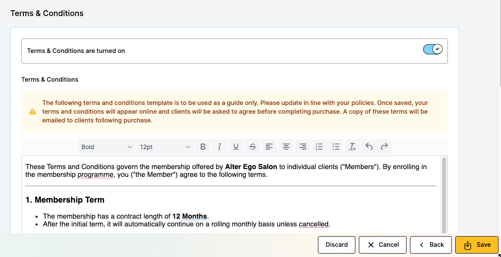 Finally, add the Terms and Conditions (T&Cs) to your Membership (if applicable), which will be displayed to clients online, and then click Save to finish.