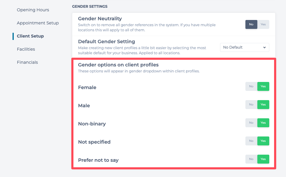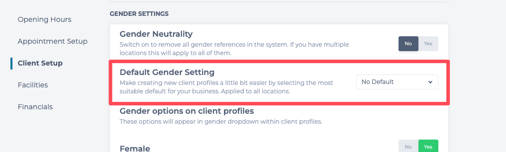 The Default Gender Setting sets the gender for any new client profiles you create. This setting only affects profiles made after the change and won't impact any existing profiles.