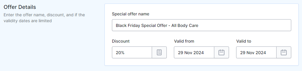 Next, give your Special Offer a name, enter the total discount amount to apply, then select the dates your offer is available from and to.