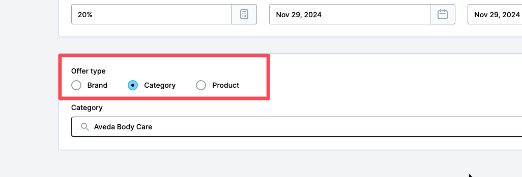 Next, select whether you want to apply the discount to the entire Brand, the entire Category, or a single Product, and then select the Brand/Category/Product.