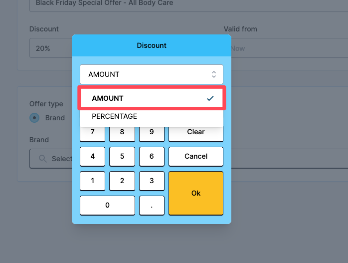 If you want to offer a monetary discount amount rather than a percentage, click the Discount field, then use the dropdown to change the discount type to AMOUNT.