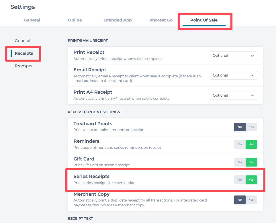 Go to Manager > Settings > Point of Sale > Receipts, then enable the Course/Series Receipts setting.