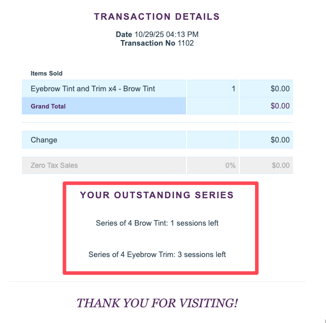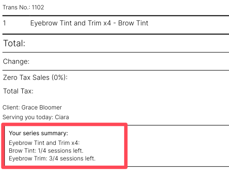 Once enabled, any remaining session information will appear on client receipts. This information will appear on all receipts, regardless of whether the client was redeeming a session or making another unrelated purchase.