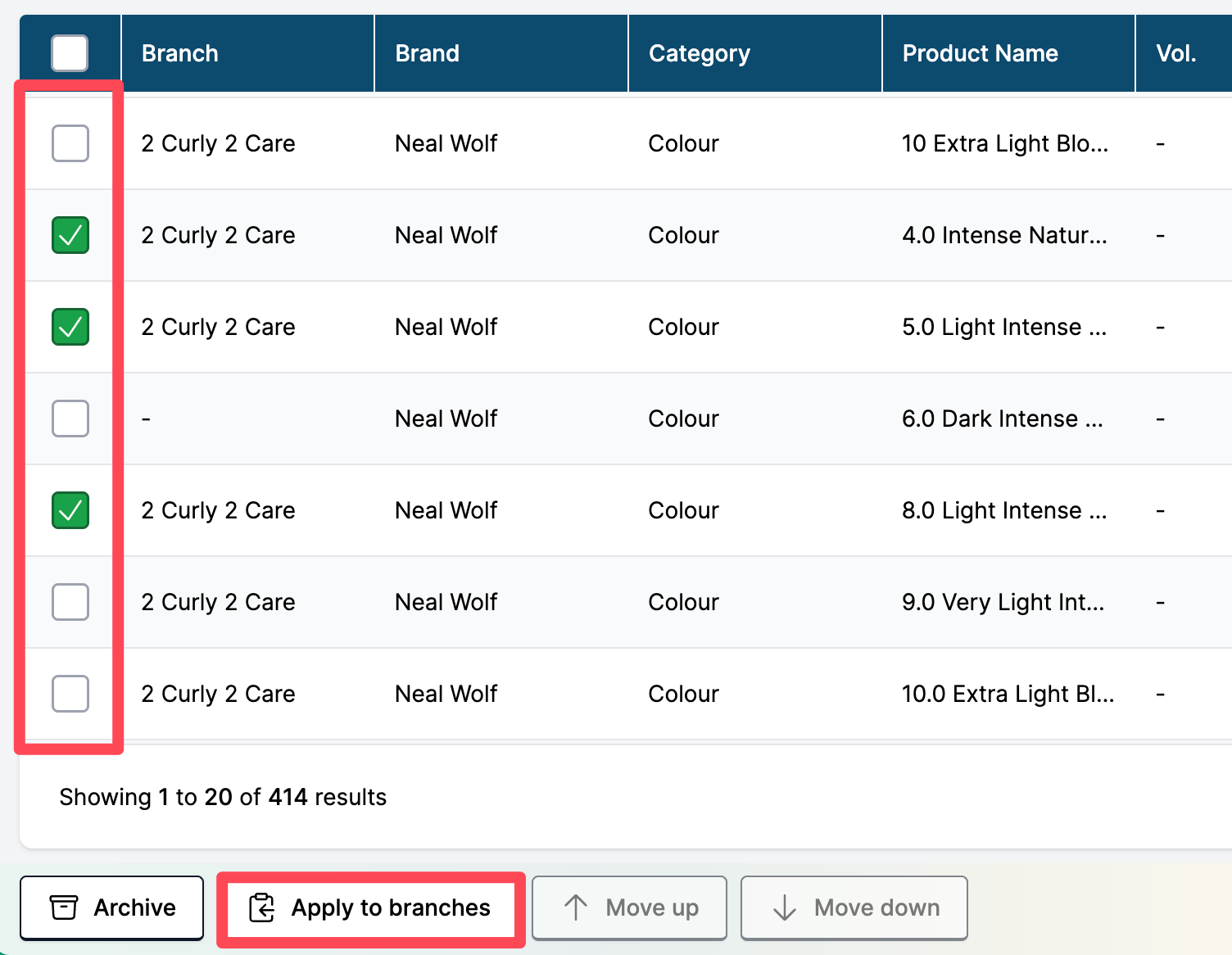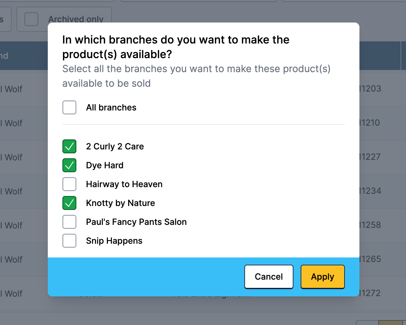 Check the boxes beside each product you wish to add to another location(s), then select Apply to branches.