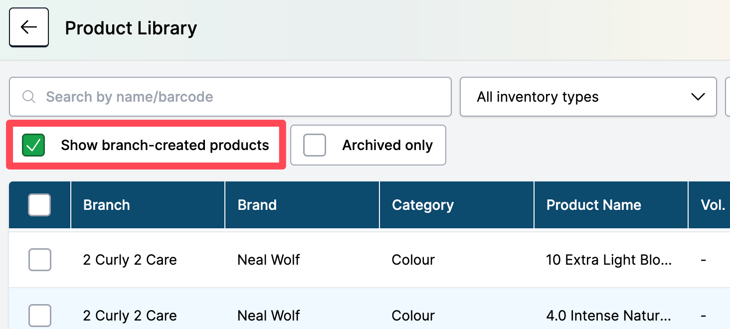Next, check the Show branch-created products checkbox in the filters area to ensure you're looking at inventory from all locations in your business.
