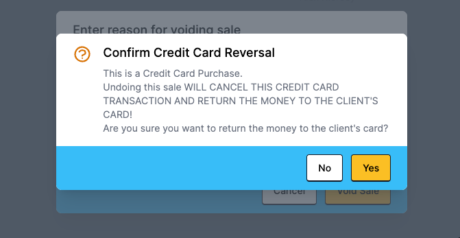 Voiding a PhorestPay sale displays the warning below to confirm that you are returning the money to the client's original card.