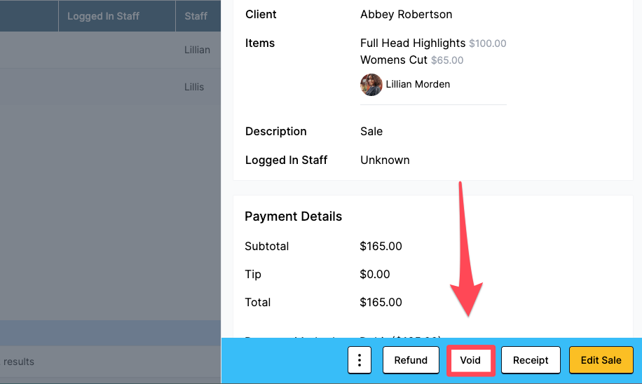Voiding a sale will reverse the entire transaction, including any original deposits associated with the appointment.