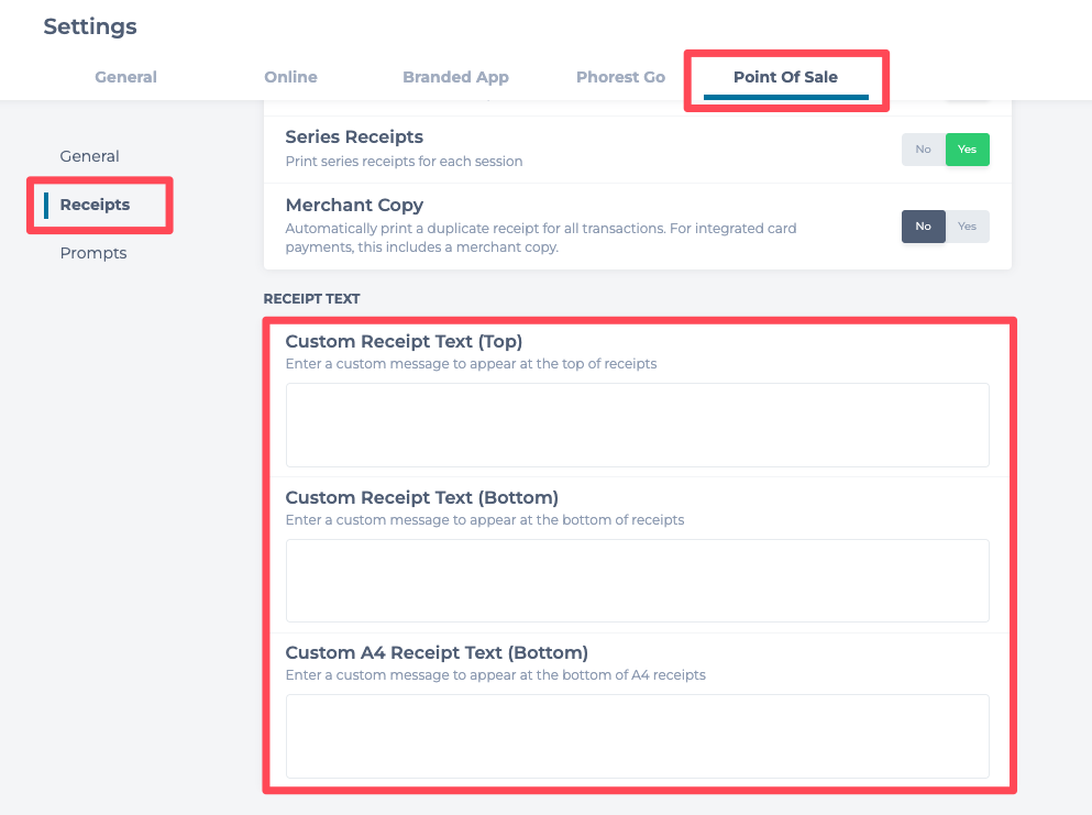 - Custom A4 Receipt Text (Bottom) - Appears at the bottom of A4 and email receipts, but not on regular printed receipts.