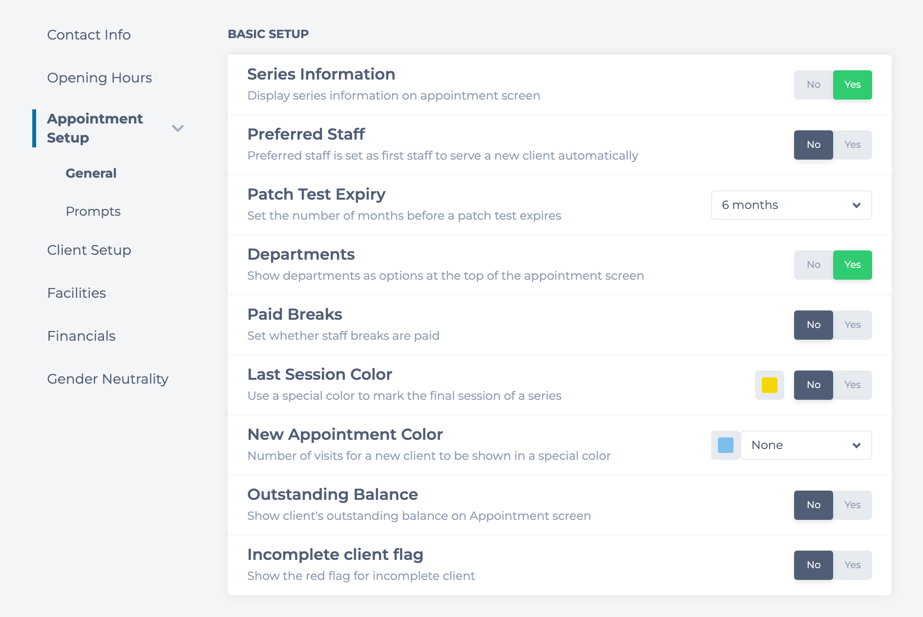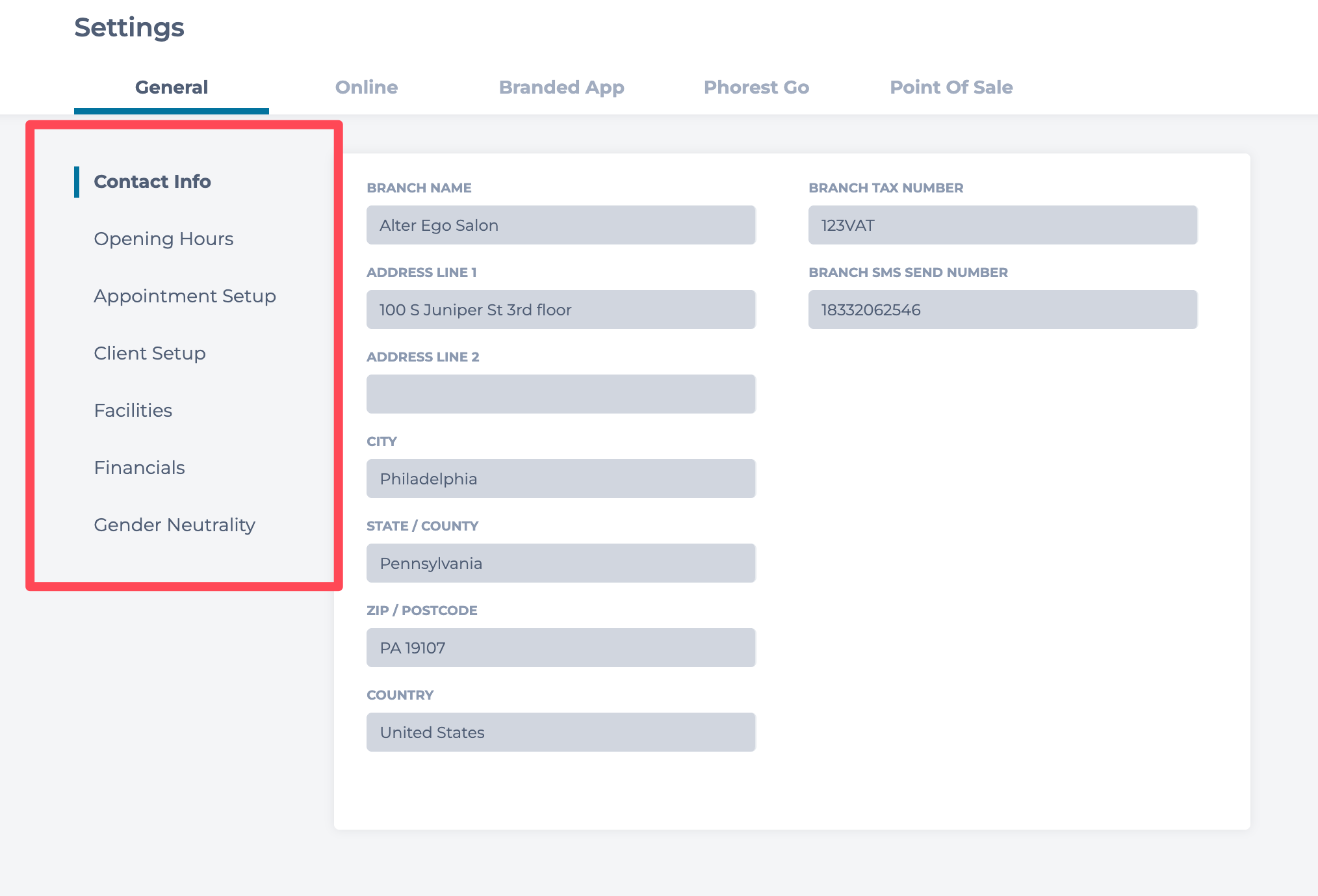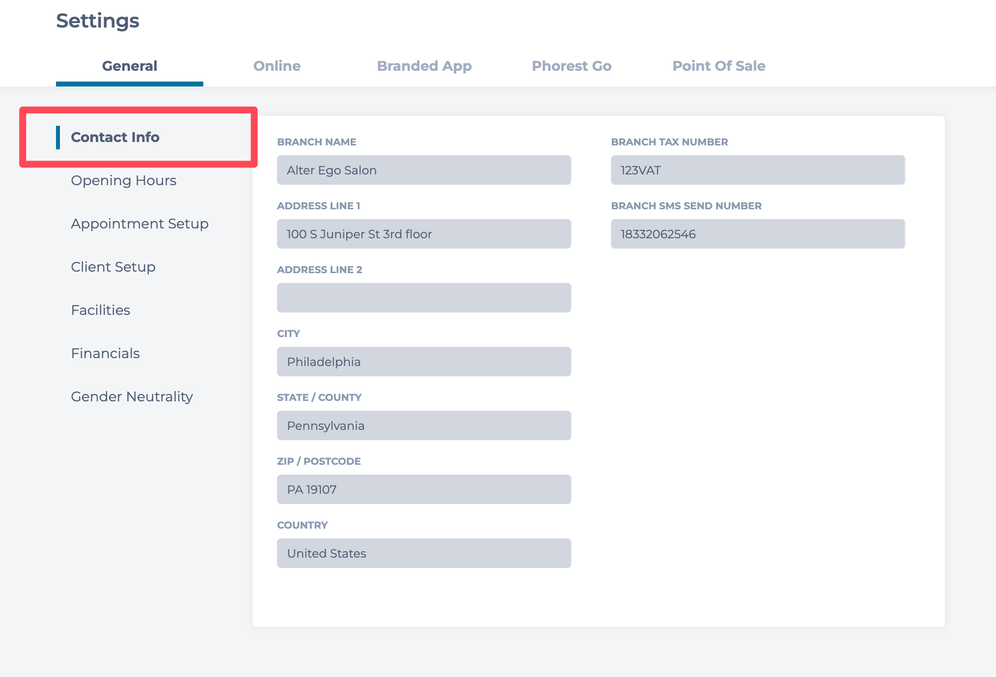 The General Settings section is split into five categories: Contact Info, Opening Hours, Appointment Setup, Facilities & Financials.